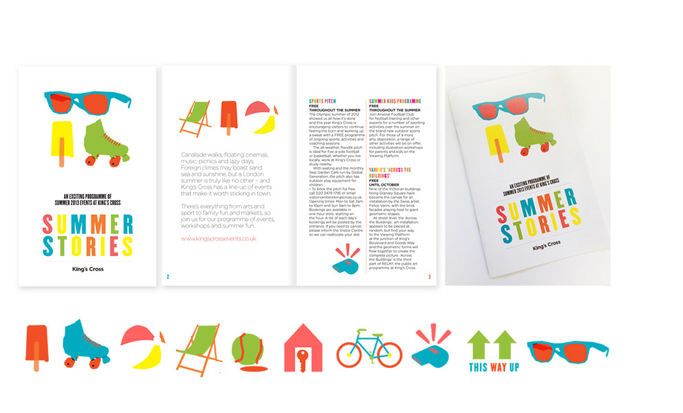 Pitch, concept, illustration and design for Kings Cross Summer Stories 2013 branding. The summer events for King's Cross regeneration space and historic heart, Granary Square. A multi-platform design strategy, including website, events booklets and 20 metre hoarding designs.